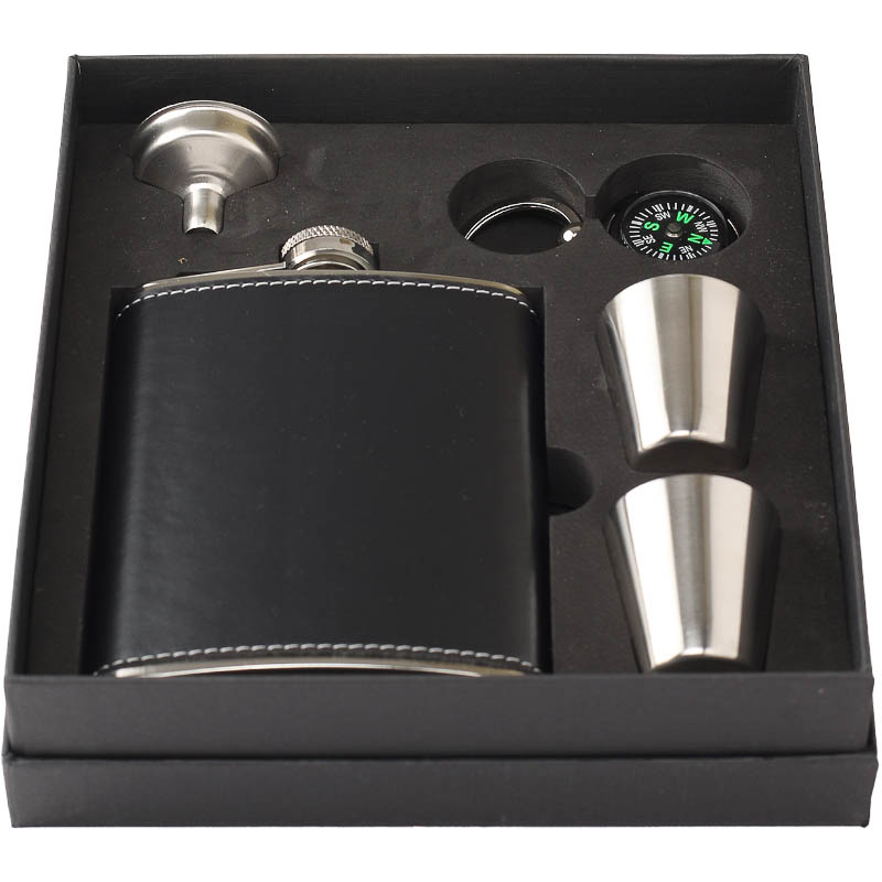 Deze luxe set bestaat uit een zakfles met drinkbekers, handige schenkteut om de zakfles te vullen en een kompas om de juiste richting te bepalen. De zakfles heeft echt zwart leder aan de buitenkant.